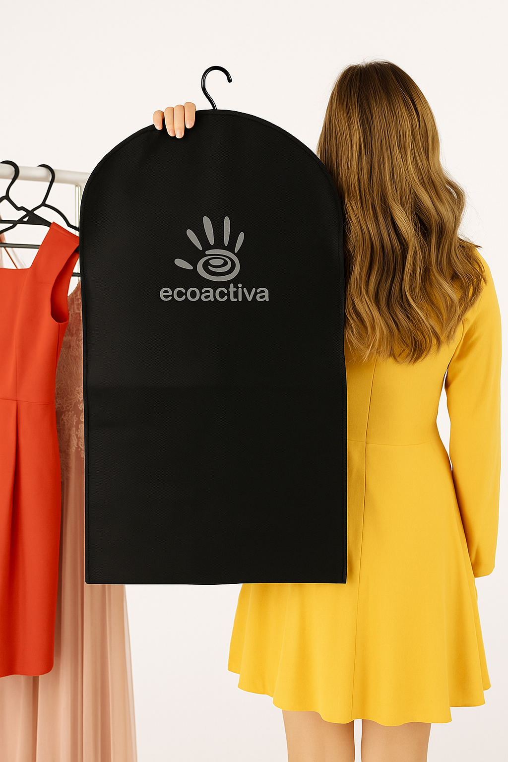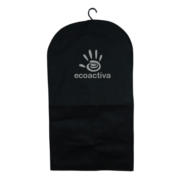 El Portavestido Ecoactiva está confeccionado en tela no tejida de 70 gramos, un material ligero, resistente y reutilizable. Con medidas de 53 cm de ancho × 100 cm de alto, incluye una abertura en la parte superior que facilita colgar el gancho de manera práctica y segura.