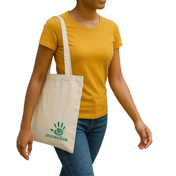 La Tote Bag Ecoactiva de 34 cm de ancho × 40 cm de alto está confeccionada en algodón natural, disponible en dos gramajes: 117 g y 142 g, que se adaptan a diferentes necesidades —ligereza para eventos o mayor resistencia para uso cotidiano.